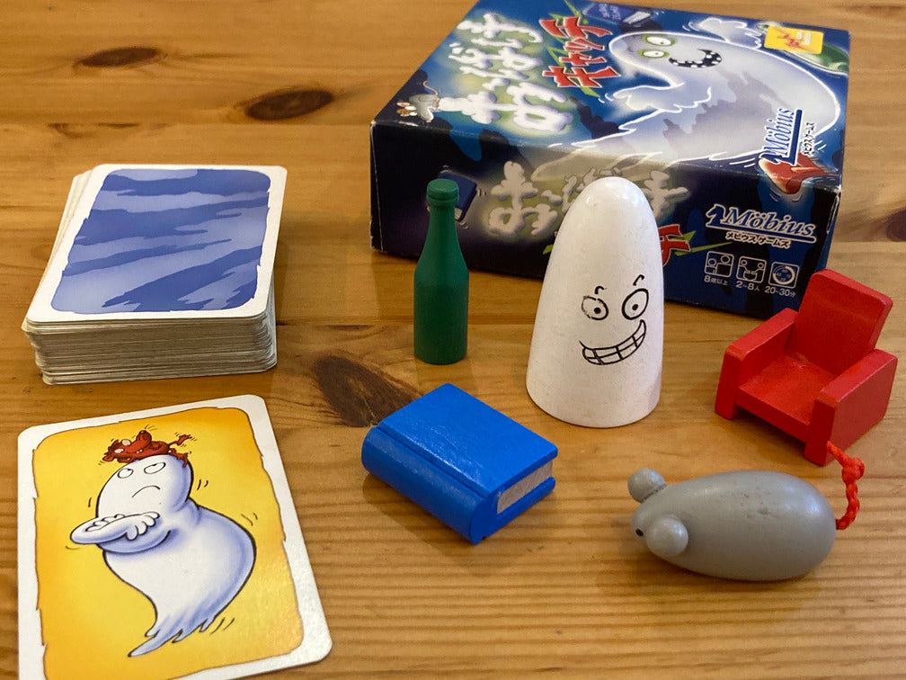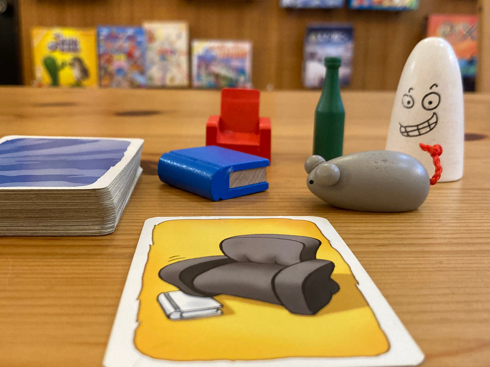 テーブルの中央に5つのコマを置きます。それは「白い-オバケ」「灰色の-ネズミ」「赤い-いす」「緑の-ボトル」「青い-本」です。