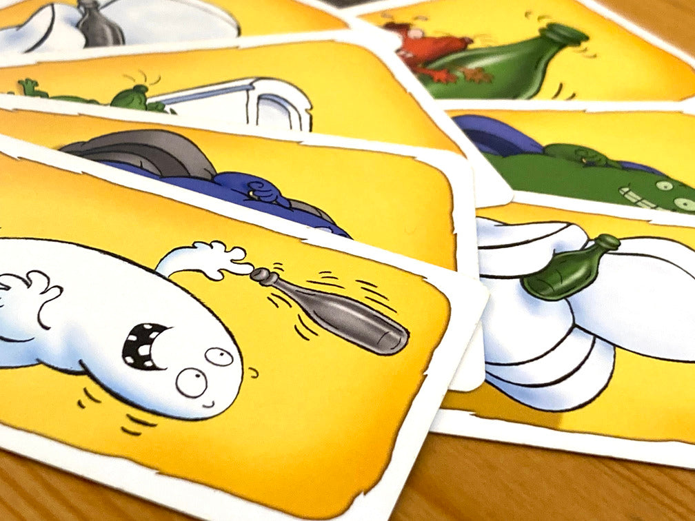 カードにコマと同じものが書かれていた場合は、それを取ります。つまりカードに「緑のボトル」が書かれていたら、それを素早く取ります。