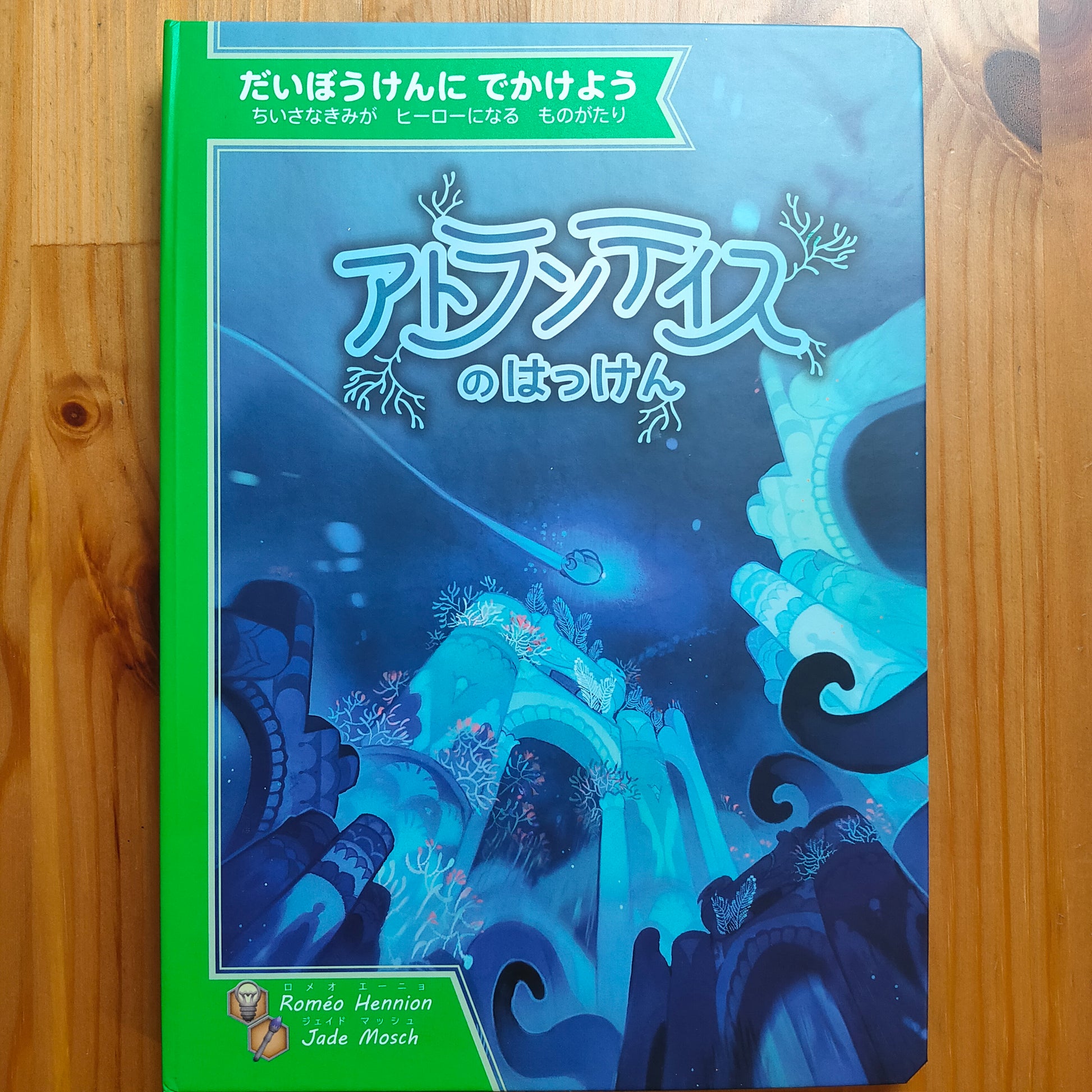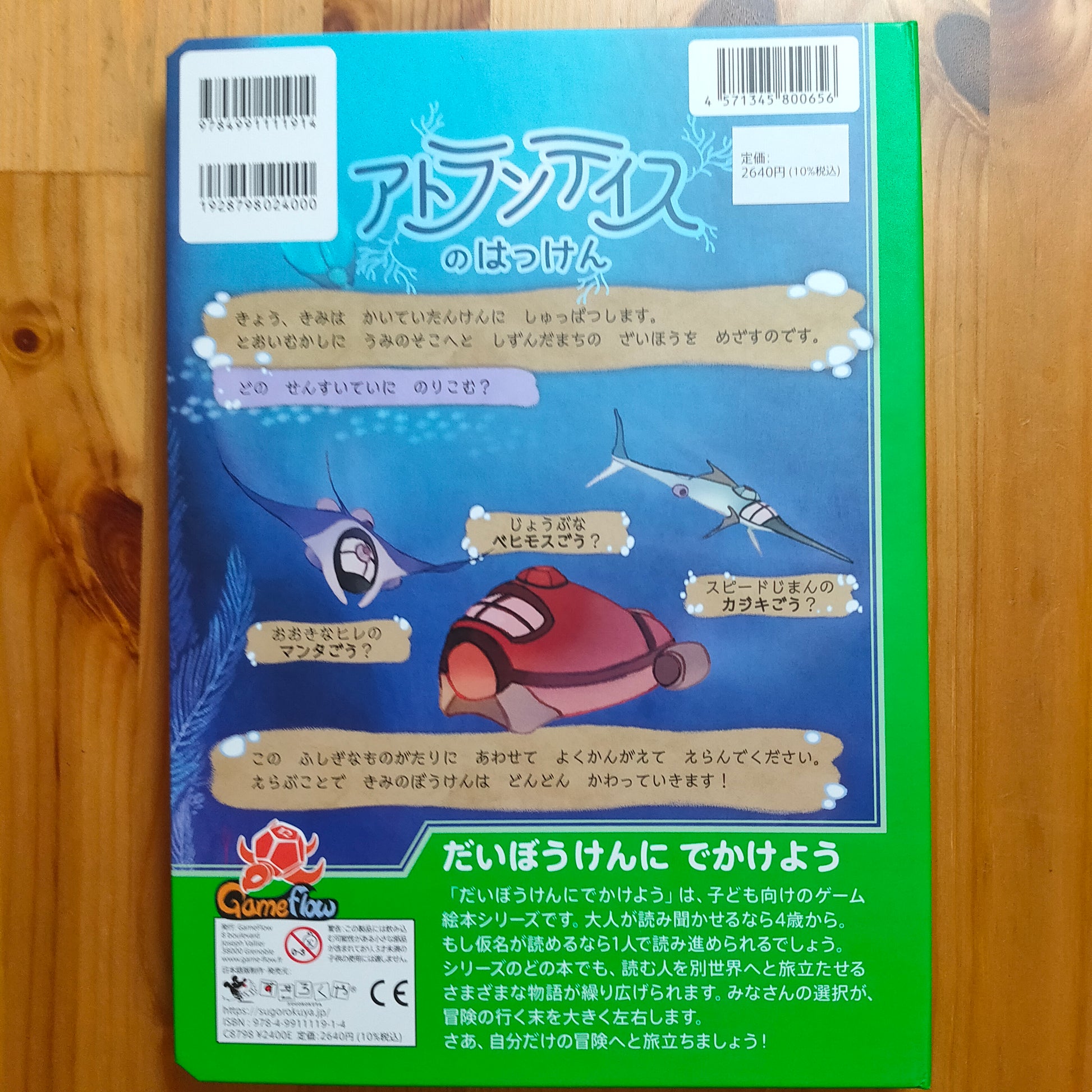 ページをめくって物語を読み進めながら、幼い冒険者となって潜水艇に乗り込み、状況ごとにときどき迫られる選択と分割ページによってお話が枝分かれし、装備を手に入れたり、水もれにみまわれたりしつつ、遠い昔に海の底に沈んだ都市「アトランティス」に眠るお宝を探す、4才から楽しめるゲーム絵本シリーズの第三弾です。
