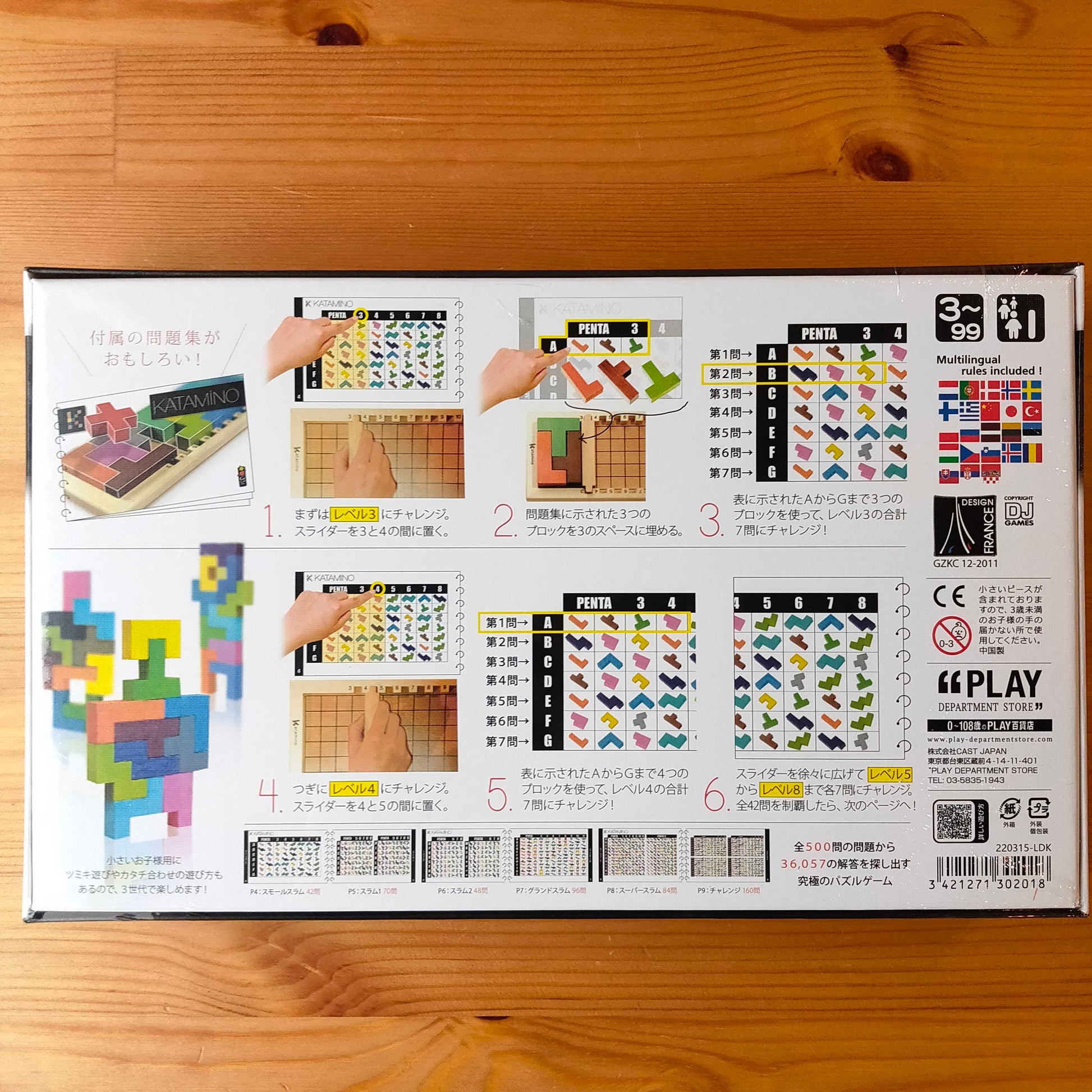 36,057の組合わせが数学的脳をつくる「カタミノ」。様々な形をしたブロックを組み合わせ、指定されたマス目を埋めていく思考型ゲーム。