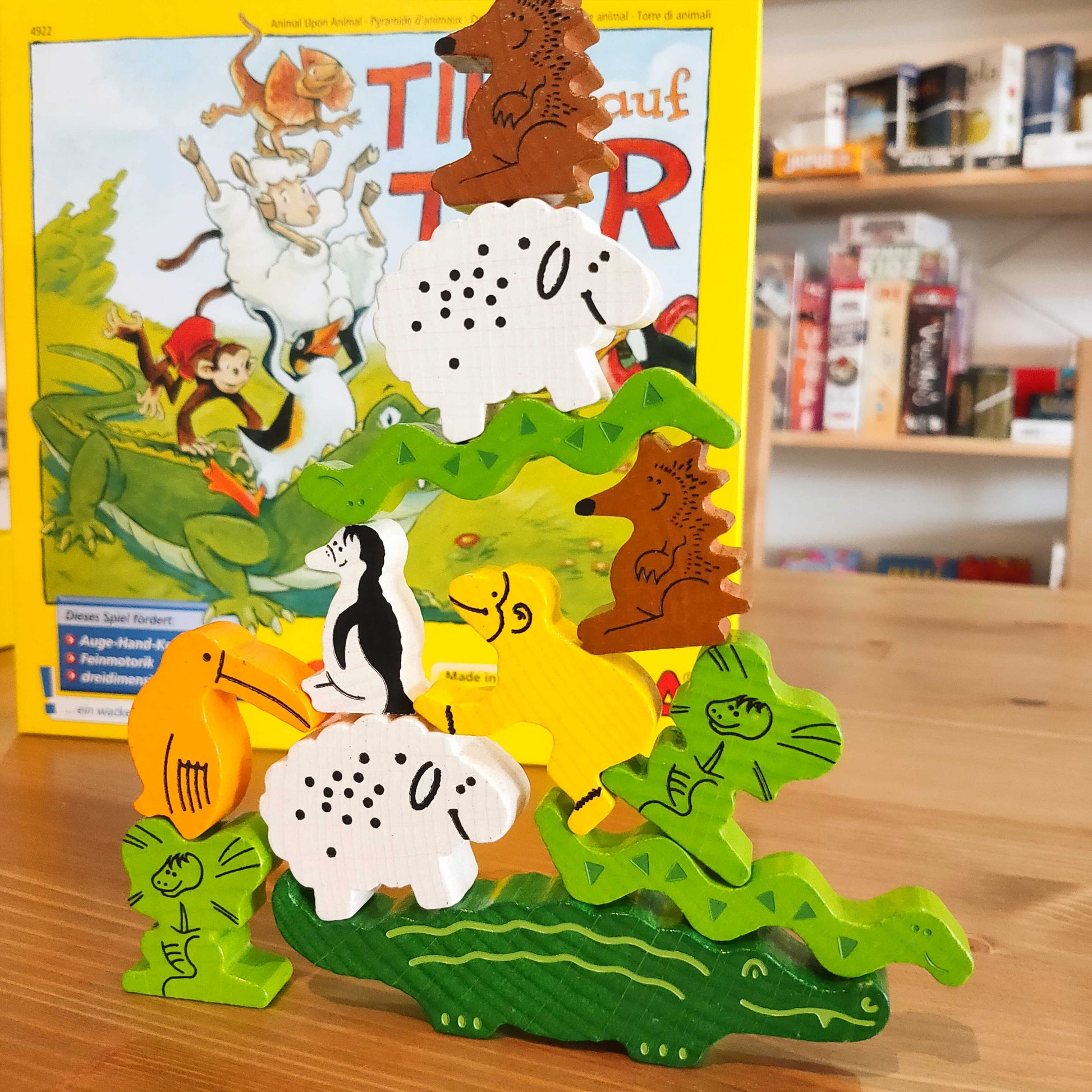 動物たちは7種類。サイコロを振り、シンボルが示す指示に従って、動物を土台となるワニに重ねていきます。「動物を2つ積もう」「友達に選ばれた動物を積もう」といった具合です。崩してしまった場合は最大2個まで崩した動物を引き取ります。最初に動物をすべて積み切った人の勝ちとなります。