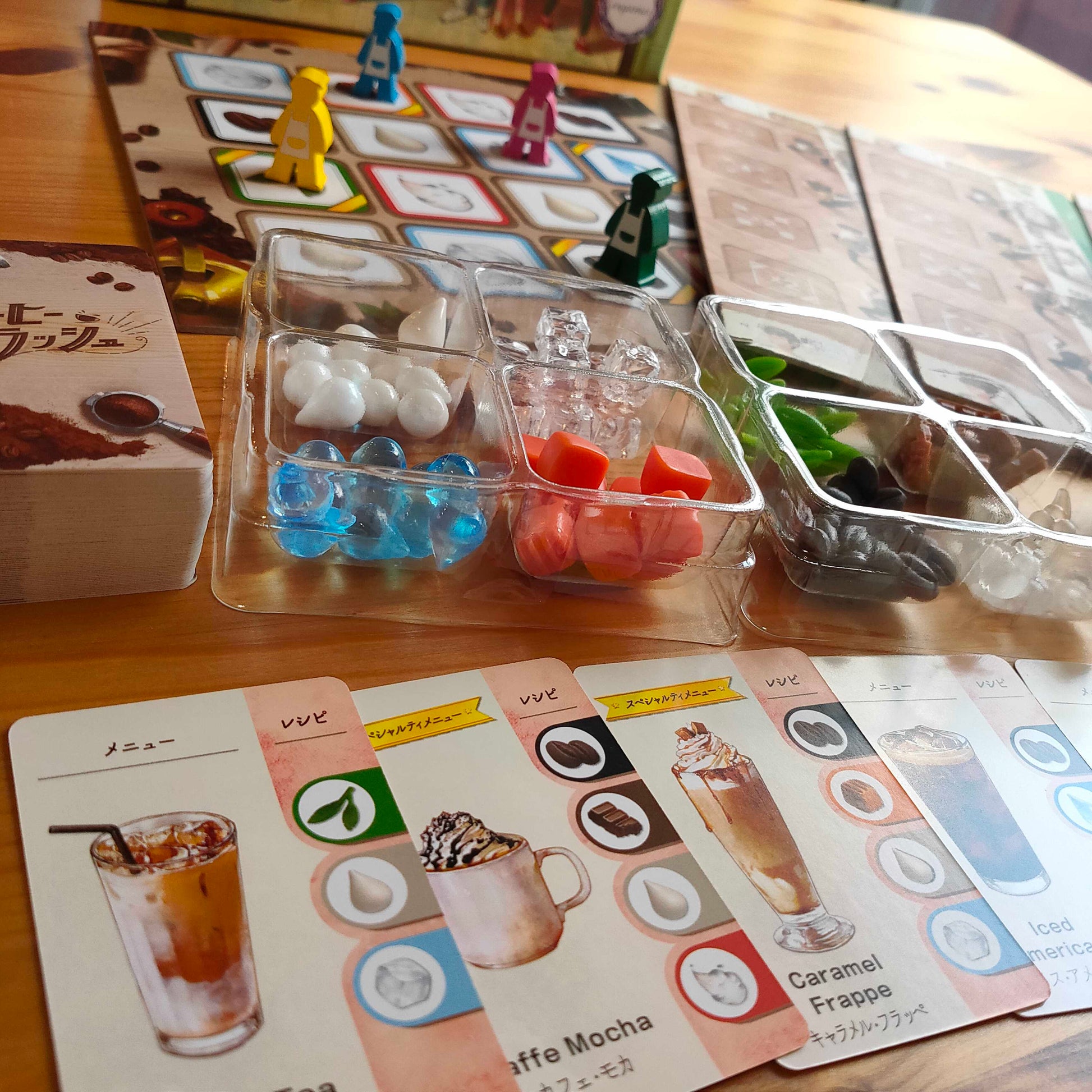 自分のバリスタ駒をボード上の縦横に3歩まで動かし、通ったマスに描かれた材料を入手します。手に入れた材料を注文カードにぴったり合うようにカップに入れたら完成!満足したお客さんからプラス評価をもらえます。さらに他の人に追加の注文が配られます。手番の最後に時間が経過します。注文を時間内にこなせなかった場合、満足できなかったお客さんからマイナス評価を付けられます。手番を繰り返し、注文カードの山札がなくなるか、誰かが5枚以上のペナルティを持っていたらゲーム終了の合図になり、全員が同じ手番数になるまで行った後、ゲーム終了になります。最も高評価を得たプレイヤーが勝利します。