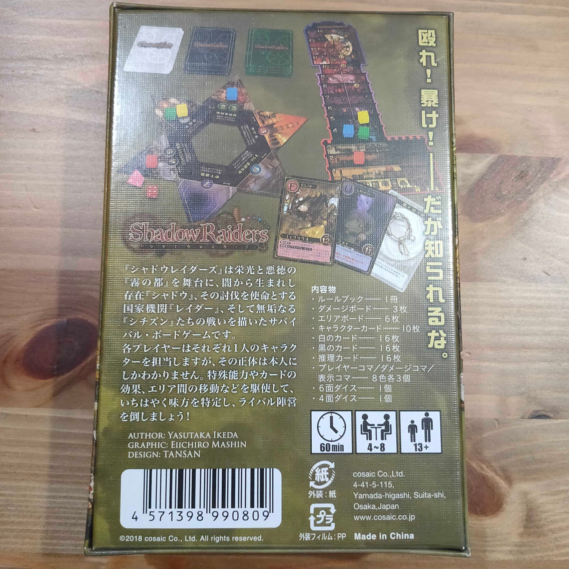 『シャドウレイダーズ』は栄光と悪徳の『霧の都』を舞台に、闇から生まれし存在『シャドウ』、その討伐を使命とする国家機関『レイダー』、そして無垢なる『シチズン』たちの戦いを描いたサバイバル・ボードゲームです。