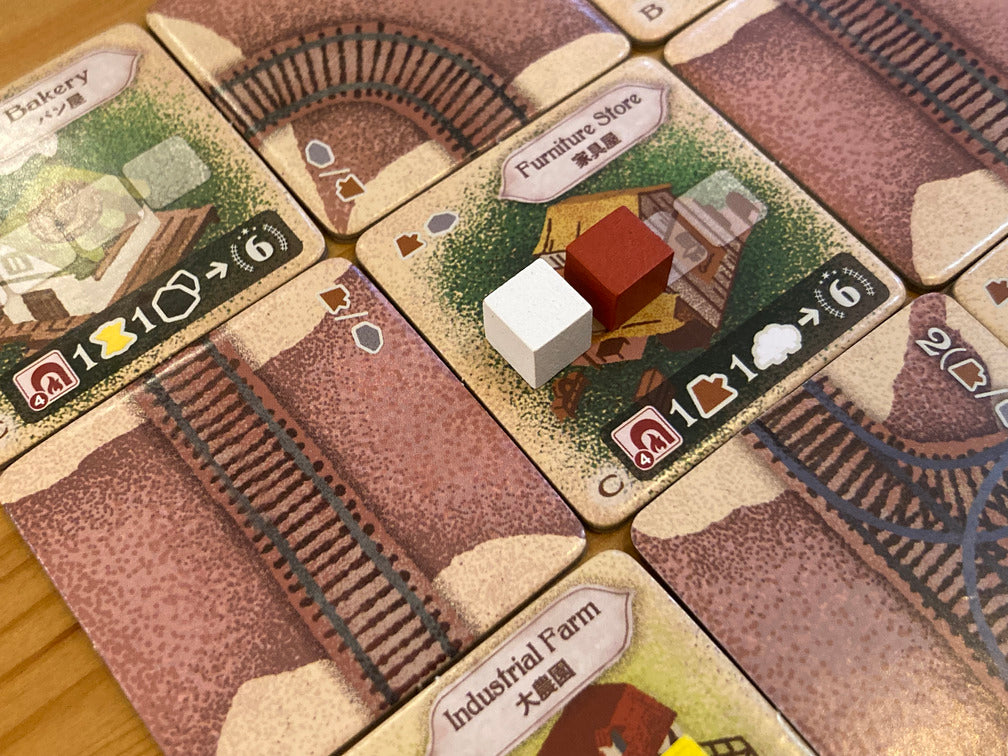 建物をたて、資源を生産し、線路を引いて輸送し、加工することで、勝利点を獲得します。