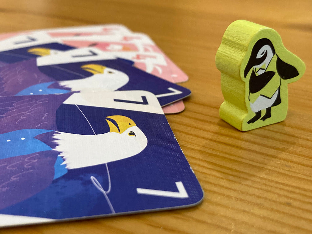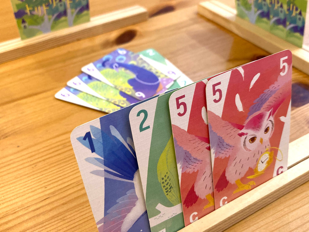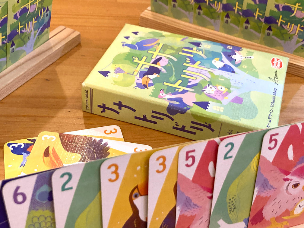 『ナナトリドリ』は、手札の数字カードを早く出し切ることを競うゲームです。同じカードを一度にたくさん出すほど強くなりますが、それにはそのカードが「手札で隣り合っている」必要があります。