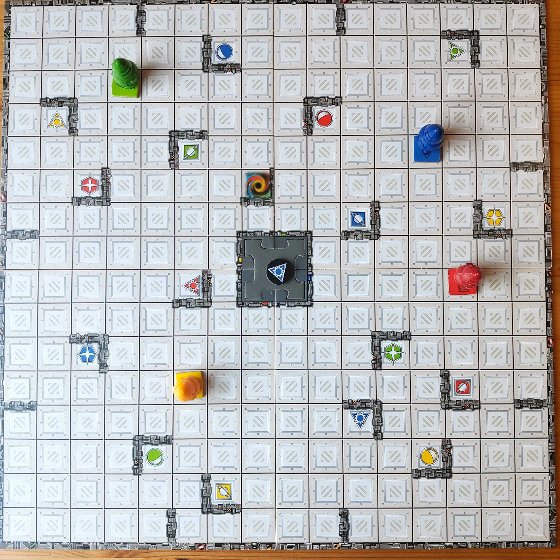 ボードの中央に、表にしたチップを置いてゲームが始まります。チップと同じ色のロボットを、そのマークと同じところに移動させる最短手順を、全員でいっせいに考えます。