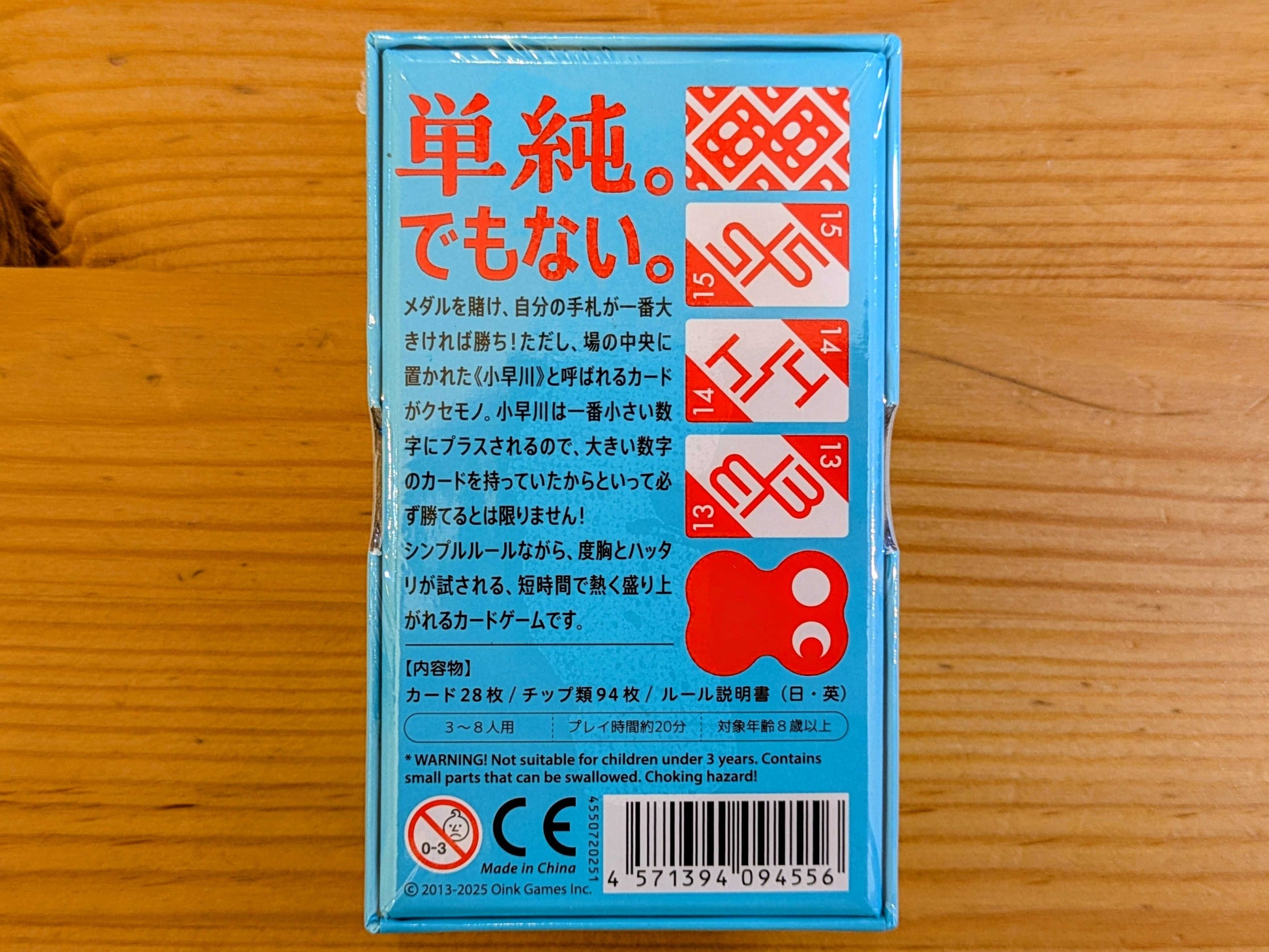 「小早川」は、カジノのギャンブルのような雰囲気を持った、シンプルなカードゲームです。カードを交換するなどの行動をしたら、最後に手元に持っている1枚のカードが全員の中で一番大きいかどうかを予想して、メダルを賭けて勝負するだけ。ただし、場の中央に置かれた《小早川》と呼ばれるカードがクセモノです。小早川は一番小さい数字にプラスされるので、大きい数字のカードを持っていたからといって必ず勝てるとは限りません。度胸とハッタリが試される、短時間で熱く盛り上がれるゲームです。