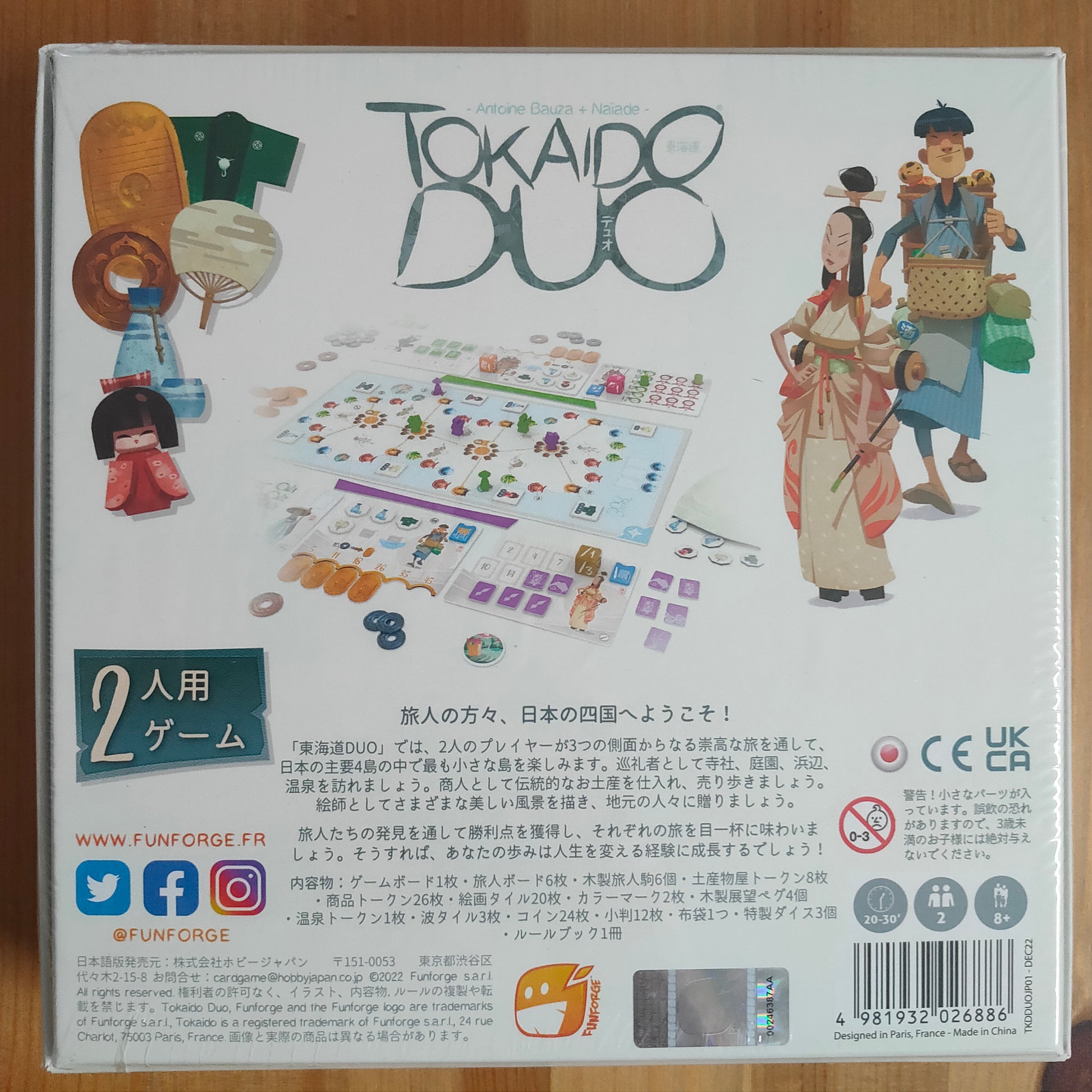 3人の旅人の動かし方がダイス目によるという、今までの『東海道』とは一味違ったシステムも楽しく、四国を表した小さいながらも様々な要素がつまったボードなど、ナイアド氏によるユニークなアートワークも魅力いっぱいの、フランス人による江戸文化テーマのファミリーでも楽しめるゲームです