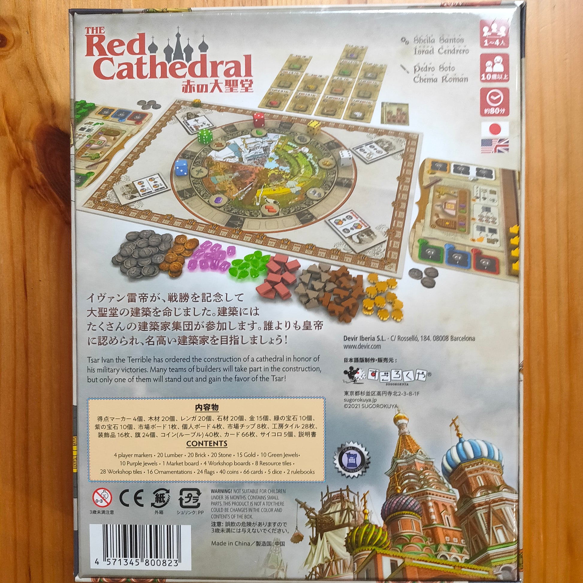 全員モスクワの大聖堂を建築する一員として、互いの動向を窺いつつ、担当したい建築区画を抑えて、そこに必要資材を送り届けることで建築を進め、ライバルよりも多く教会の建築に貢献し、皇帝からの評価点を集めるゲームです。