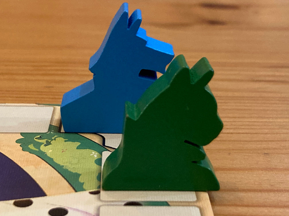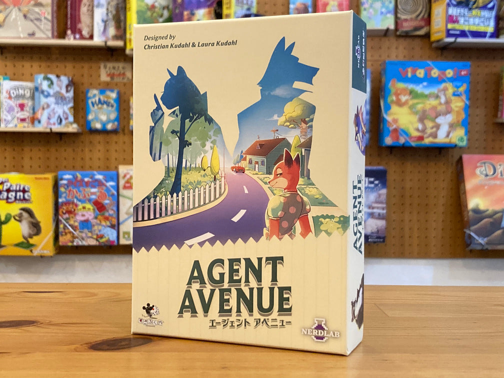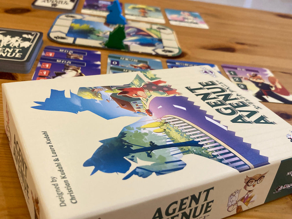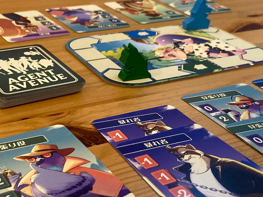 『エージェントアベニュー』は、手札から選んだ2枚のカードを表と裏で提示し、相手にどちらか1枚を選ばせて残り1枚は自分が確保、を繰り返し、確保したカード効能の累積によって自コマを進めて相手コマに追いつくことを目指す2人用対戦ゲームです。