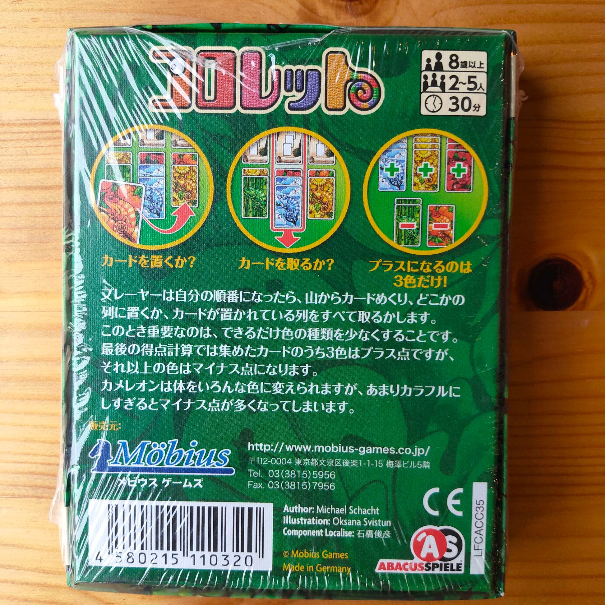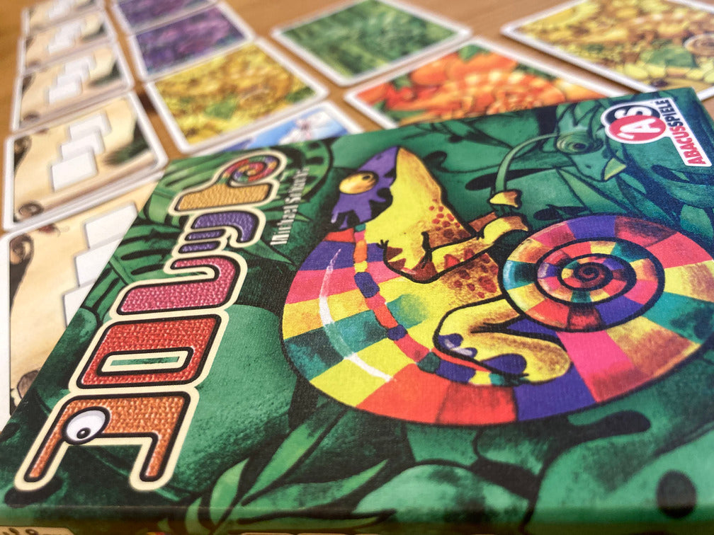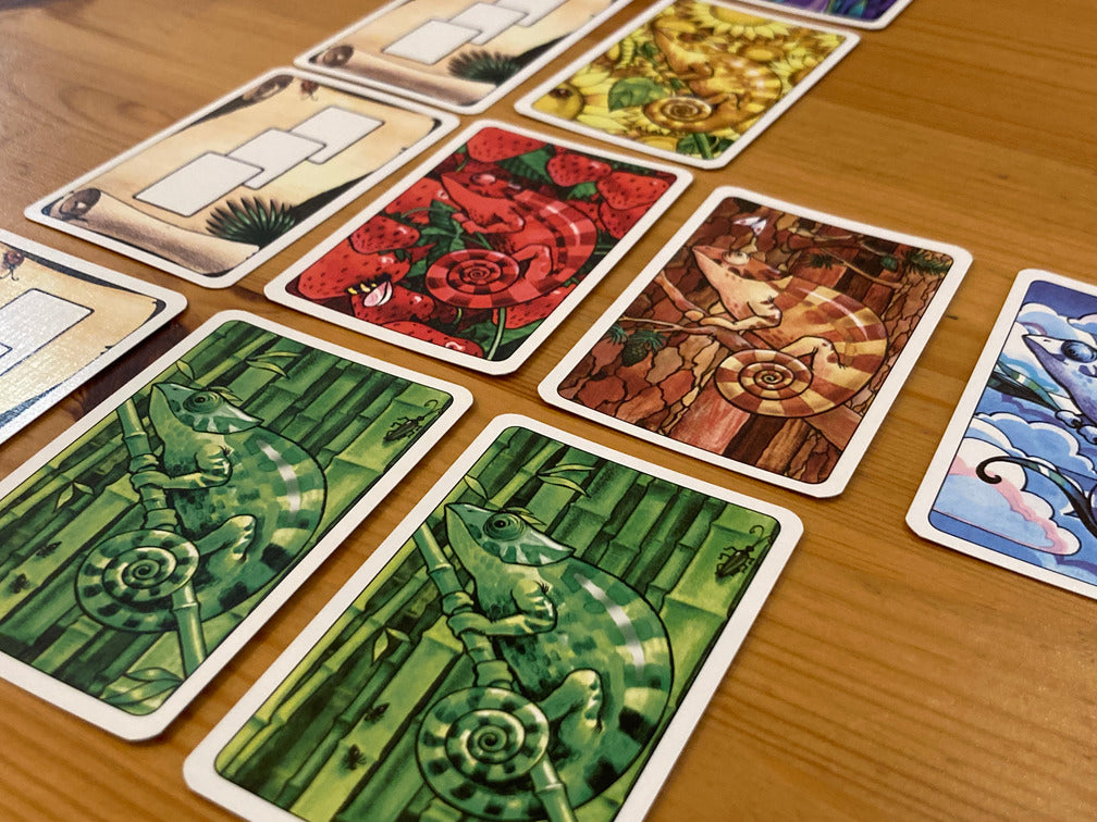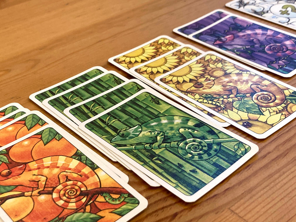 手番になったら、伏せた山の一番上のカードをめくるか、テーブルの上のカードを1列取るかをします。伏せた山のカードの一番上をめくったら、いずれかの列カードに表にして並べて置きます。ただし、どの列も列カードのほかに4枚以上のカードを並べることができません。つまり3枚のカードが並んでいる列にはもうそれ以上置けないのです。すべての列に3枚のカードが並んでいたら、このアクションは選択できません。テーブルの上のカードを1列取る場合は、列カードを残して、最大3枚並んでいるその列のカードすべてを取って、いったんゲームから抜けます。取られた列にサイドカードを置くことはできません。すべてのプレーヤーが1列ずつ取ったら、ゲームを再スタートします。これを数ラウンド行って、伏せた山のカードがなくなったら、得点計算です。取ったカードはすべて得点計算しなければなりません。7色のカードの内、3色はプラス点として計算できますが、4色目以降はマイナス点となります。