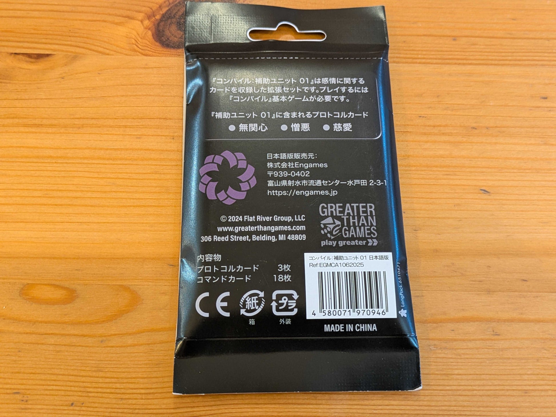 『コンパイル:補助ユニット 01』は感情に関するカードを収録した拡張セットです。プレイするには『コンパイル』基本ゲームが必要です。