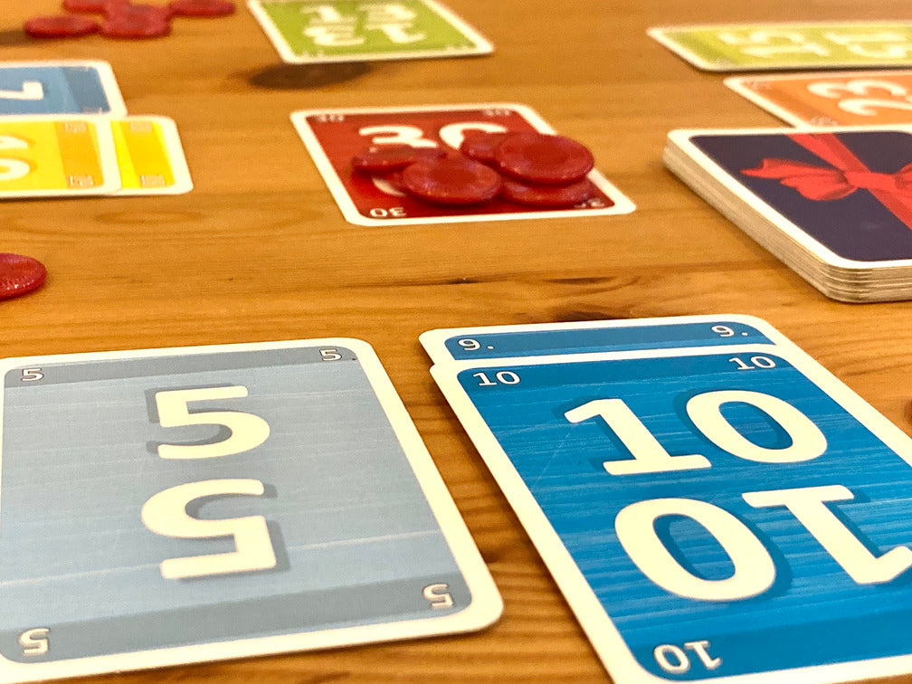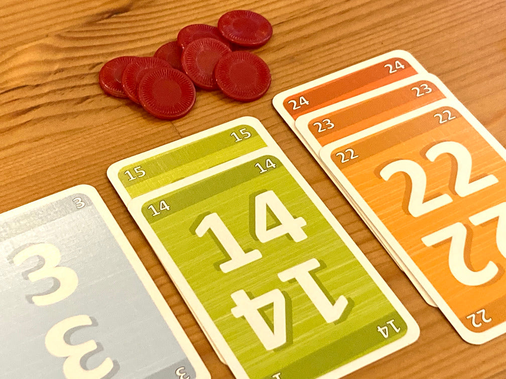 まず、カードの裏向きの山にし、そこから1枚表にします。手番プレーヤーは、表になったカードを引き取るかどうかを判断します。引き取ったカードはその数字がマイナスポイントです。引き取るのがいやな場合は、チップを1枚出して次の人の手番になります。チップは1枚プラス1ポイントです。カードを引き取ると決めた場合は、そこに置かれたチップも一緒に取ることができます。しかし、そのまま次のカードを表にして、そのカードを引き取るかどうかの判断をせねばなりません。