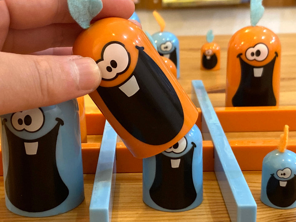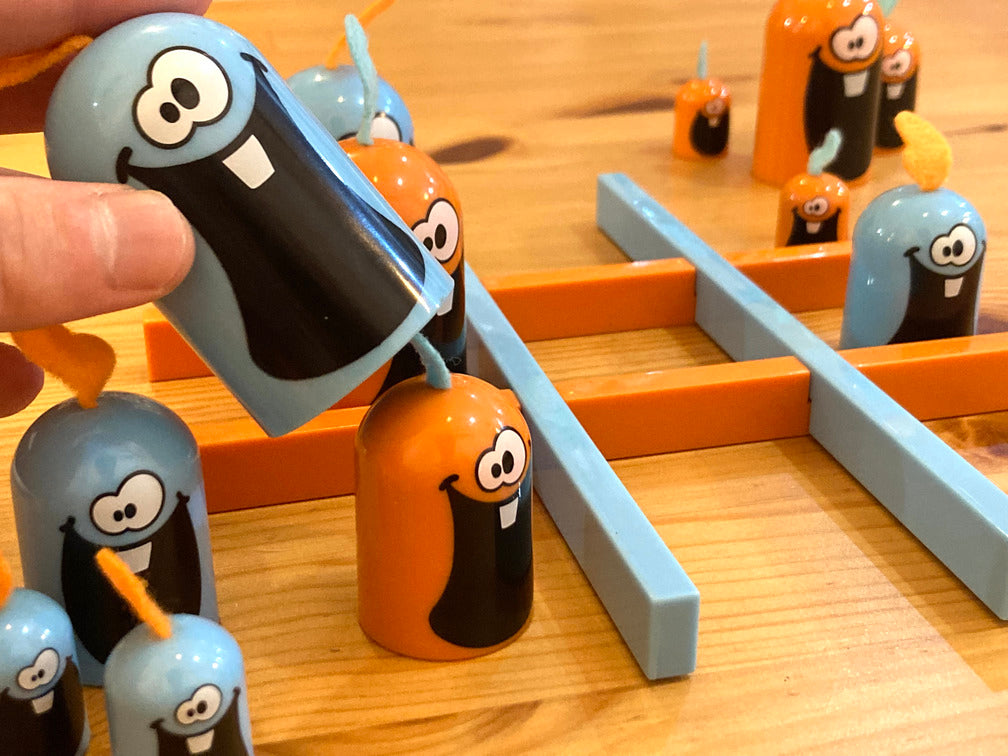 3×3のマス盤面に自色駒の縦/横/斜めの1列を作るため、駒を置いたり、動かしたり、小中大のサイズ差を活かして被せたり、被せを外したりしていく対戦ゲームです。