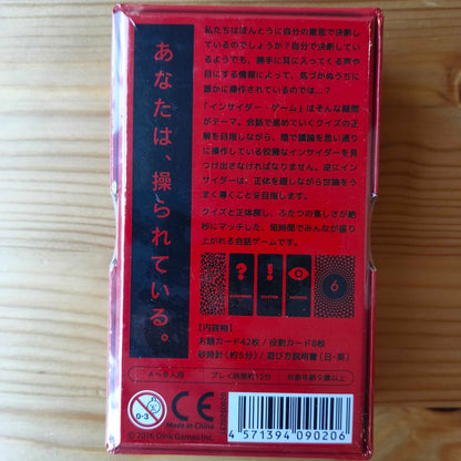 クイズと正体探し、ふたつの楽しさが絶妙にマッチした、短時間でみんなが盛り上がれる会話ゲーム。会話で進めていくクイズの中、陰で議論を思い通りに操作している狡猾なインサイダーが紛れこんでいます。インサイダーは、正体を隠しながら世論をうまく導こうとしているのです....!