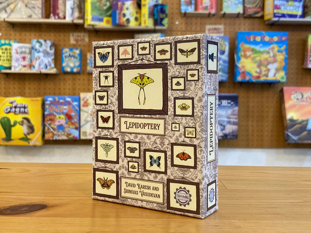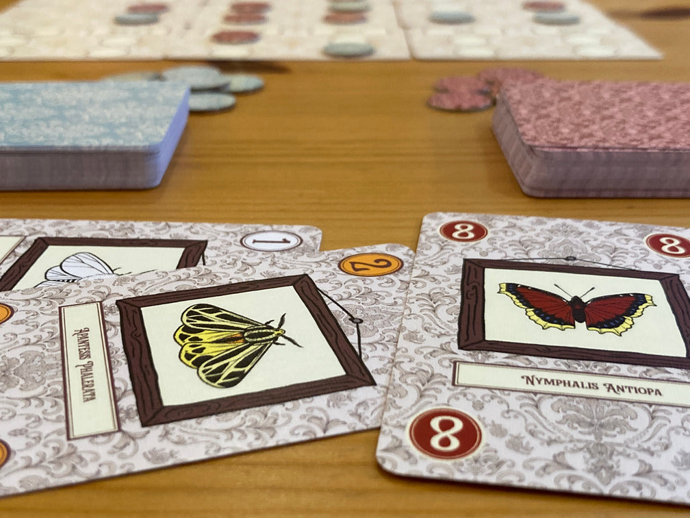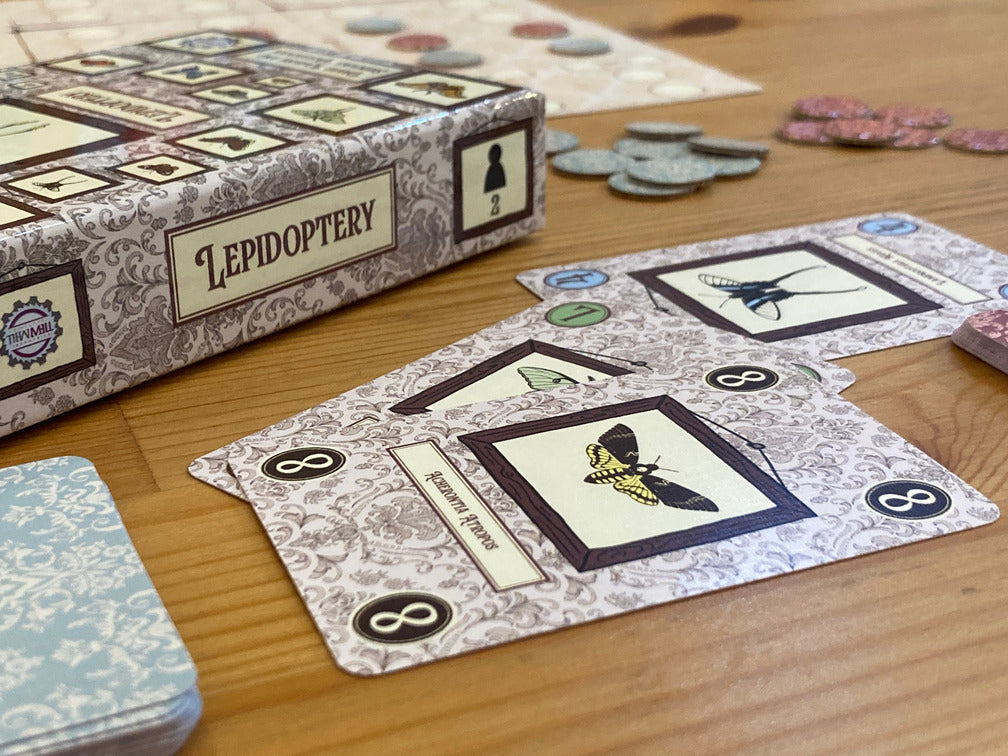 レピドプテリーは、コネクトフォー(四目並べ)とクライミングゲーム(大富豪系ゲーム)を組み合わせた2人用ゲームです。カードの組み合わせを出して盤面にチップを置き、チップ4つを一列に並べるか、山札と手札を出し切ると勝利します。