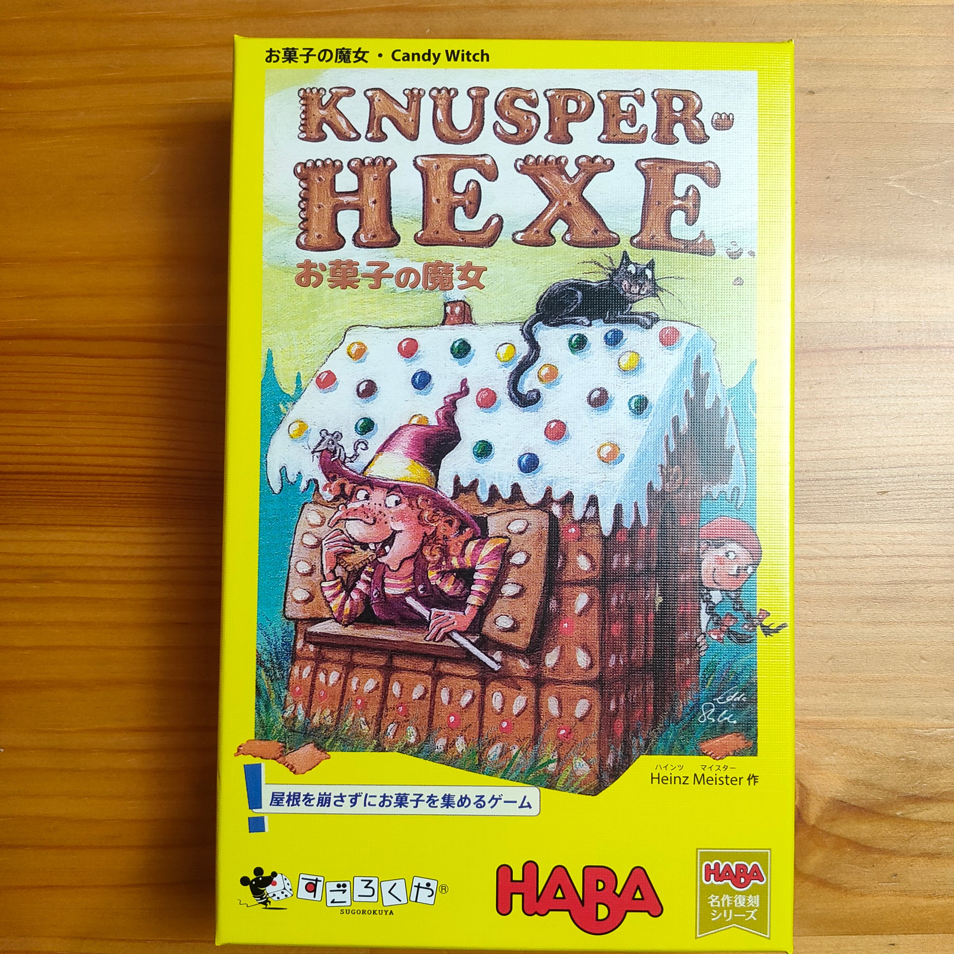 『お菓子の魔女』は、カードだけで立体的に作られた「お菓子の家」の危なげな均衡の屋根から、カードを1枚ずつ引き抜いて集めたり、表側のお菓子の絵柄に応じて戻したりして、ザァッ!と屋根を崩してしまった人以外で枚数を競うゲームです。