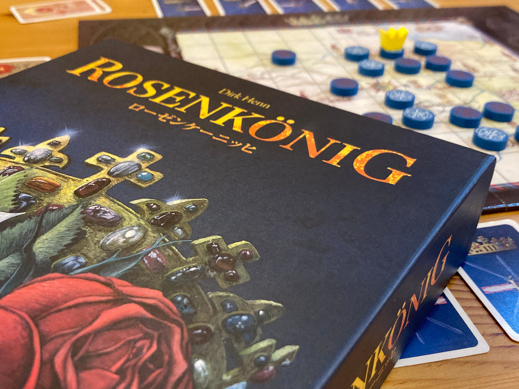 「方向」と「距離」が描かれたカードを使い「王冠コマ」を操作し、「王冠コマ」の移動先に自分の領土を増やしていきます。領土は孤立しているよりも、縦横が接続している個数が重要となり、隣接して連続する個数の2乗が得点となります。