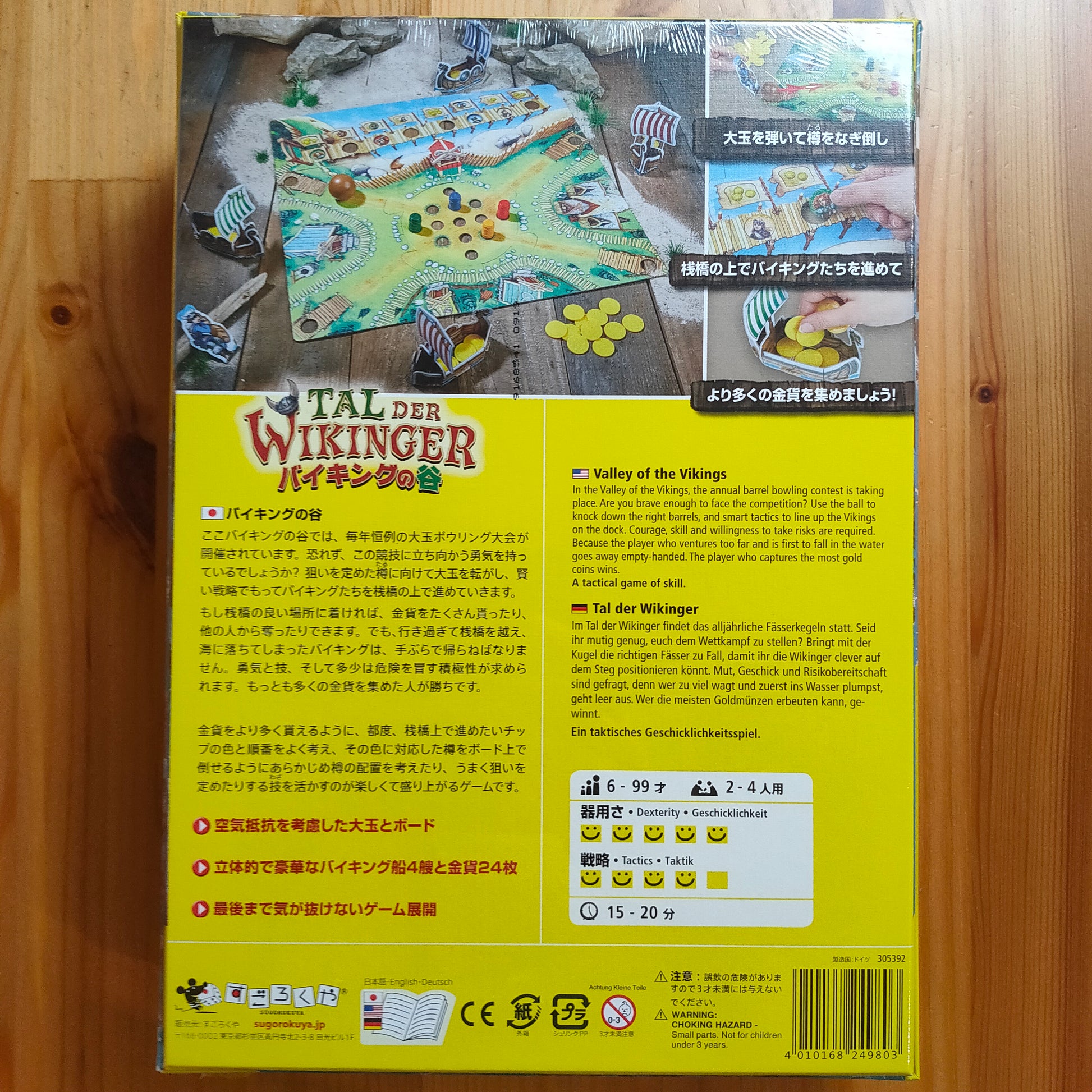 ボウリングのような大玉転がしでボード上の樽の色を狙ってなぎ倒し、倒した色に対応したバイキングチップを桟橋のマスで進めることで、より多く金貨がもらえるような位置取りや決算のタイミングを計るゲームです。